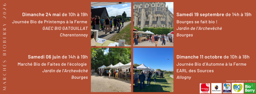 L'association BioBerry organise chaque année 2 journées bio à la ferme et une journée en ville "Bourges se fait bio". Elle participe également à d'autres évènements : De Ferme en Ferme, Faites de l'écologie, marché de Noël.