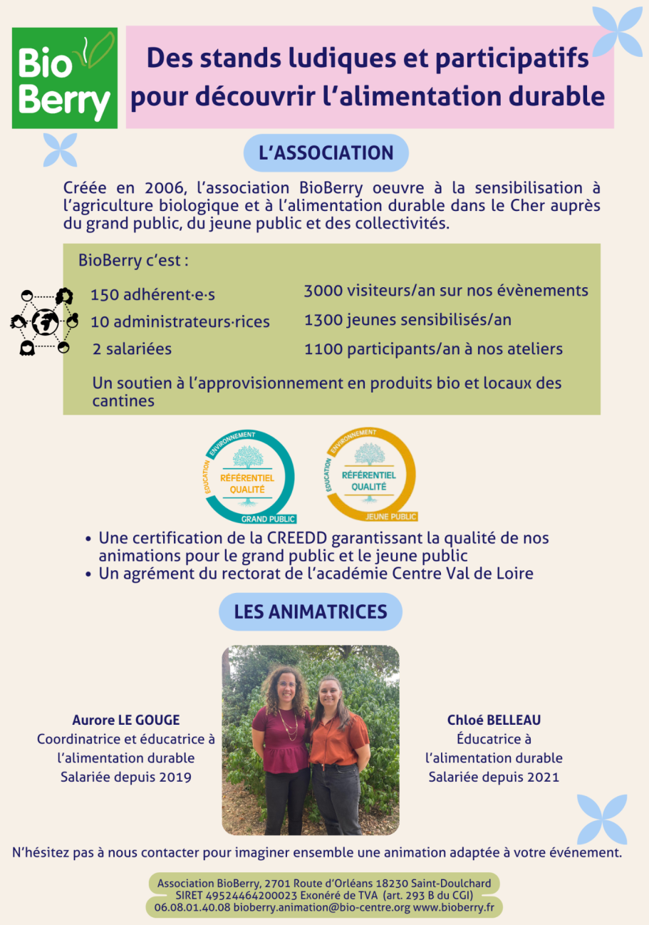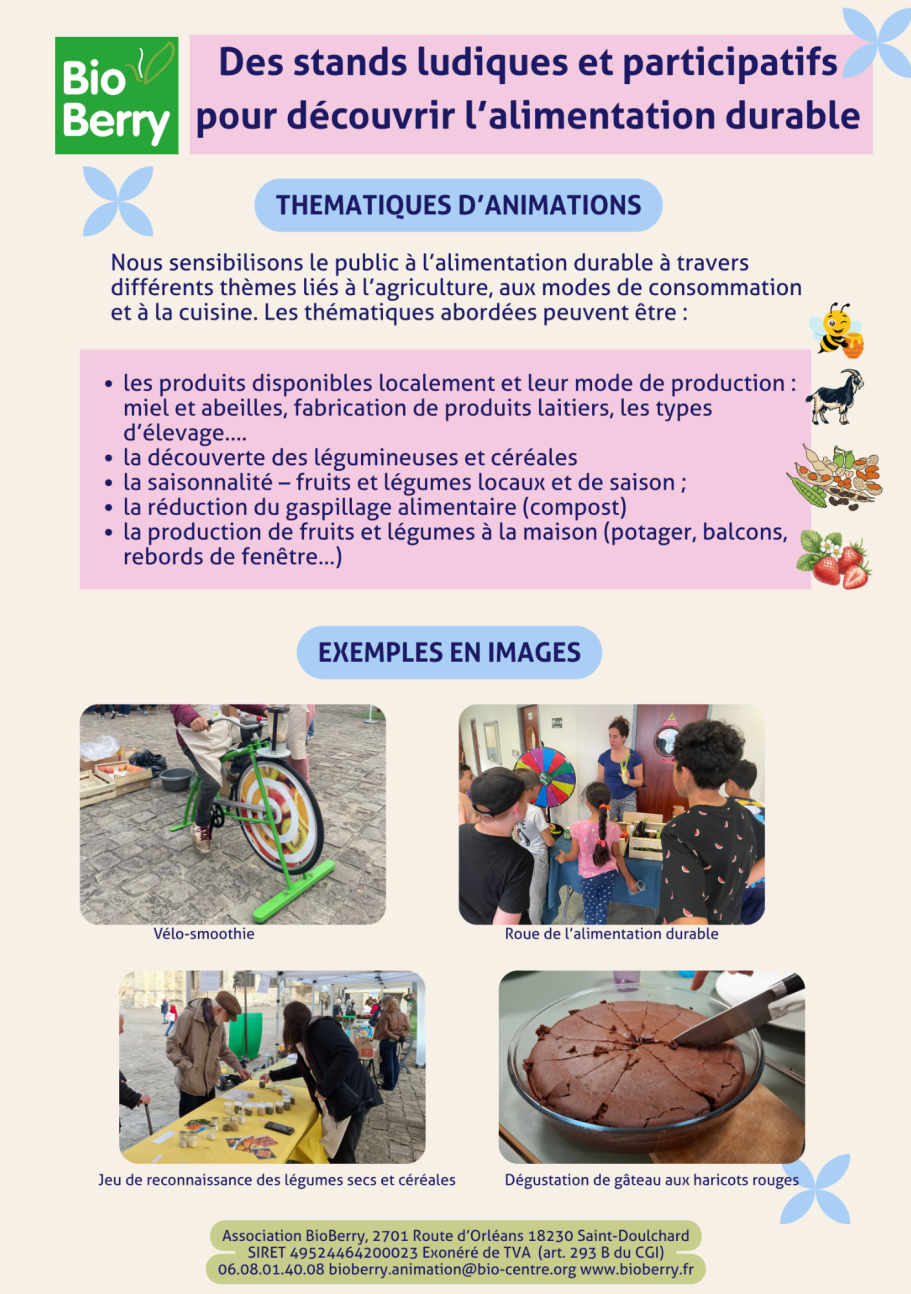 À l'association BioBerry, nous nous engageons à créer des animations pédagogiques et ludiques qui mettent en lumière l'importance de l'agriculture biologique et d'une alimentation durable. Nos animations mettent en avant les bienfaits de l'alimentation durable pour la santé, l'environnement et la société. Elles visent à donner les clés aux participants pour faire des choix alimentaires plus éclairés. Elles s'adaptent à vos besoins et à votre public :