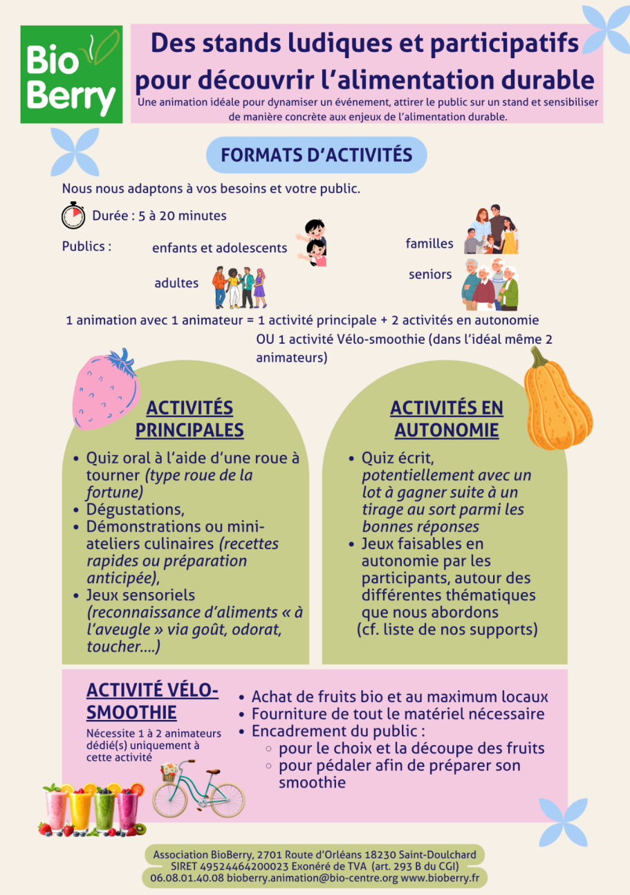 - Sur stand passant : démonstration de cuisine, dégustation, jeux, vélo-smoothie (faire un smoothie en pédalant), peintures végétales... Le participant passe 5 à 20 minutes sur le stand.
